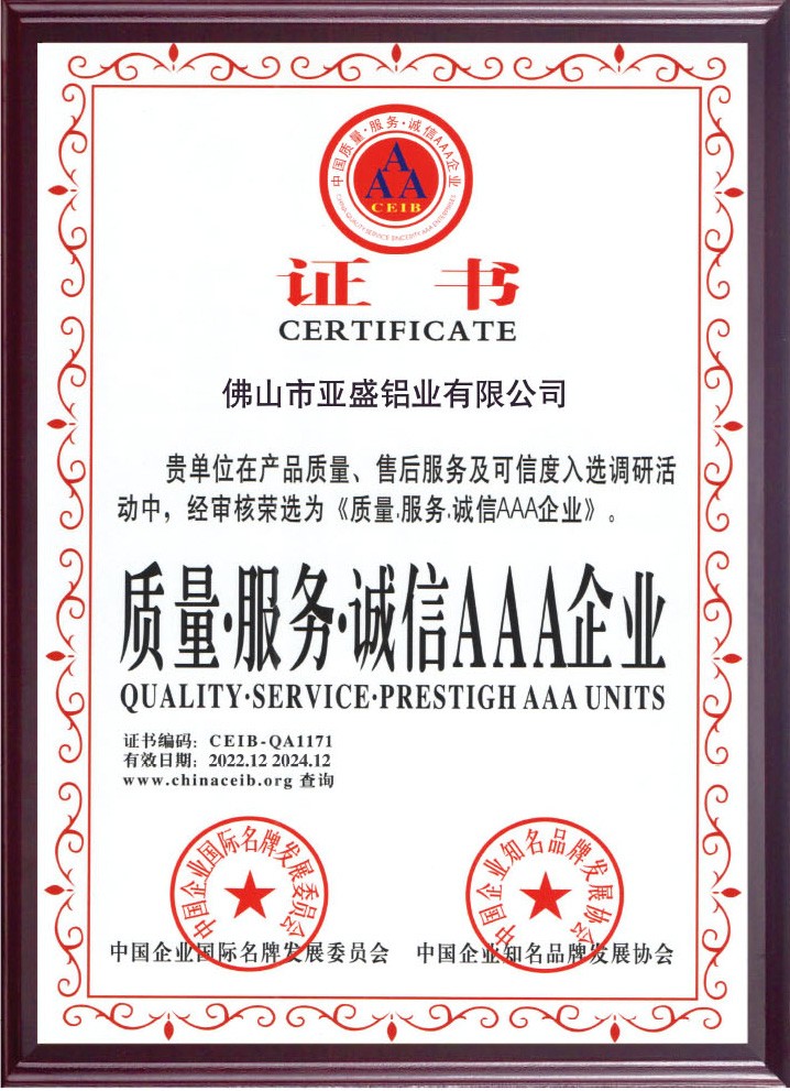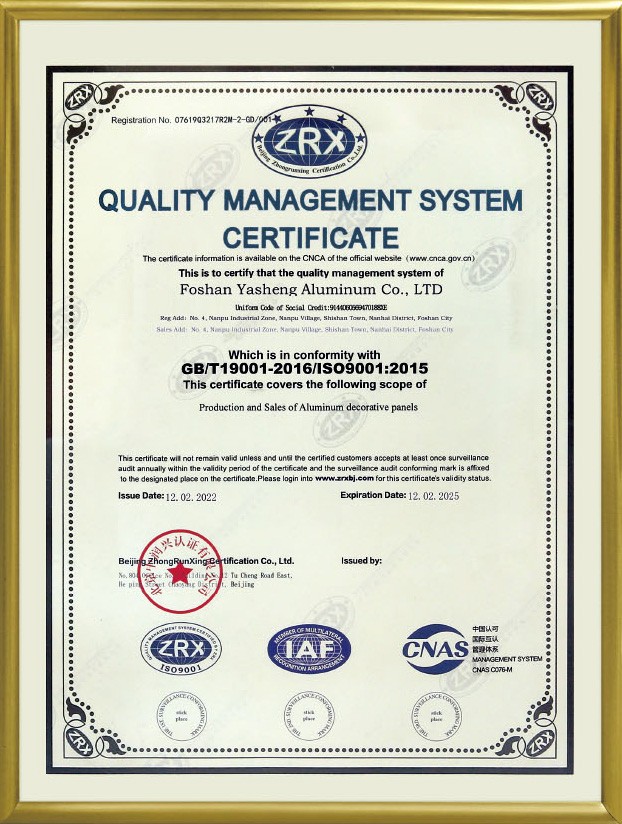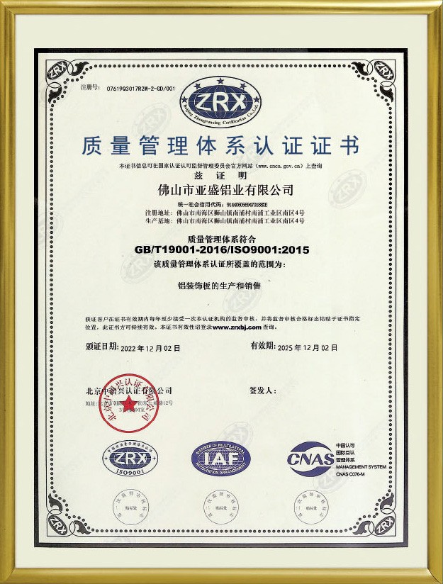 公司現已全麵通過(guò)ISO9001:2008國際質量管(guǎn)理(lǐ)體係認證。鋁單板和鋁蜂窩板的產品質量(liàng)均(jun1)通過了國家建材測試中心檢測。塗層質量技術已達到美(měi)國AAMA2605的要求。板材的物理性(xìng)能和其他質量技(jì)術(shù)指標均達到美國ASTM標準。公司本著“重質量、重誠(chéng)信、重創(chuàng)新、重服務”的理念(niàn),堅持用戶至(zhì)上,服務(wù)周全原則,用心解決客戶所憂;以科技和優質產品服務客戶;始終堅持以“想顧客之所(suǒ)想,急(jí)顧客之所急”的經營理念,不斷(duàn)開拓創新,與時俱進,使“91prom在线视频”品牌(pái)係(xì)列產品得到市場、客戶和專家的一致認可和深受廣大國內外客戶的(de)好評。